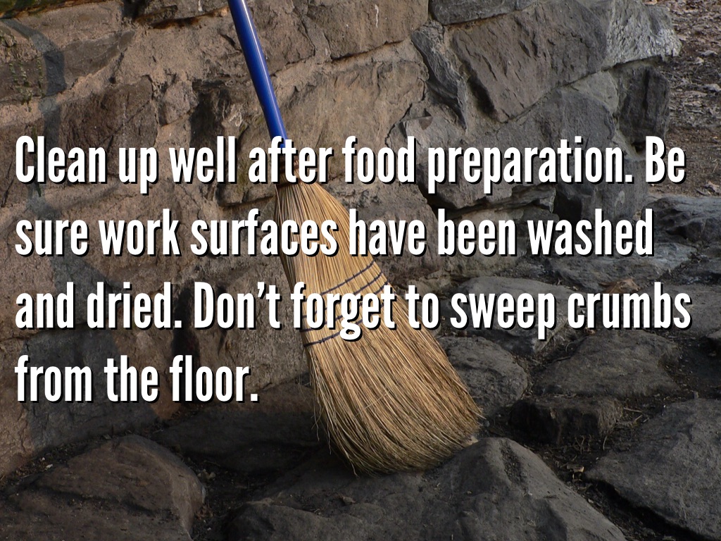 Clean up well after food preparation. Be sure work surfaces have been washed and dried. Don't forget to sweep crumbs from the floor.