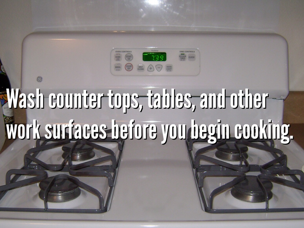 Wash counter tops, tables, and other work surfaces before you begin cooking.