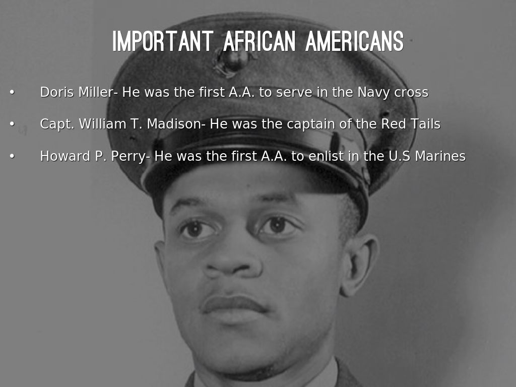 Doris Miller- He was the first A.A. to serve in the Navy cross