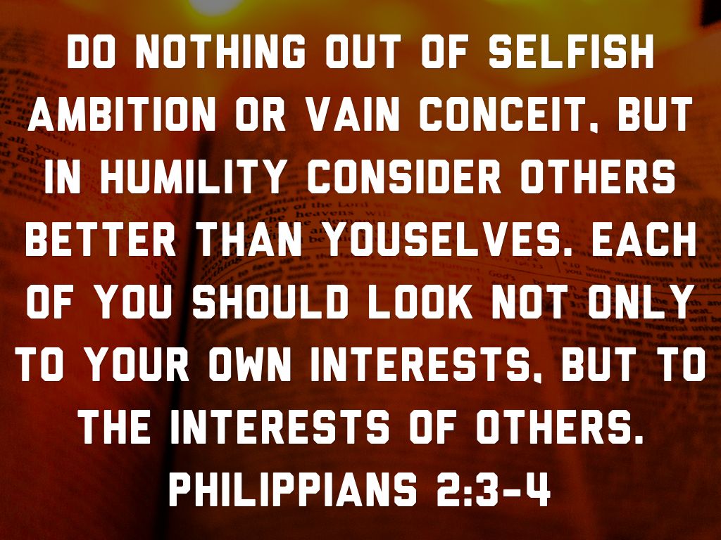 Do nothing out of selfish ambition or vain conceit, but in humility consider others better than youselves. Each of you should look not only to your own interests, but to the interests of others. Philippians 2:3-4