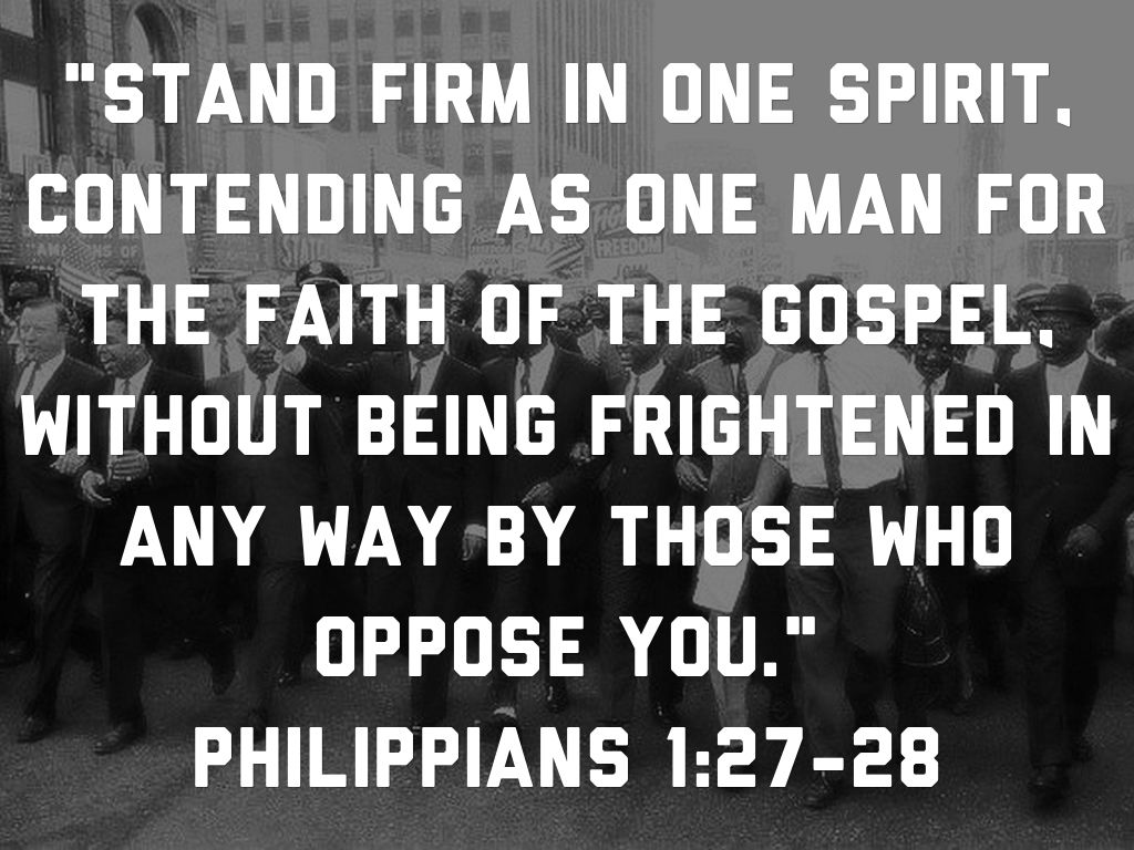 "Stand firm in one spirit, contending as one man for the faith of the gospel, without being frightened in any way by those who oppose you." Philippians 1:27-28