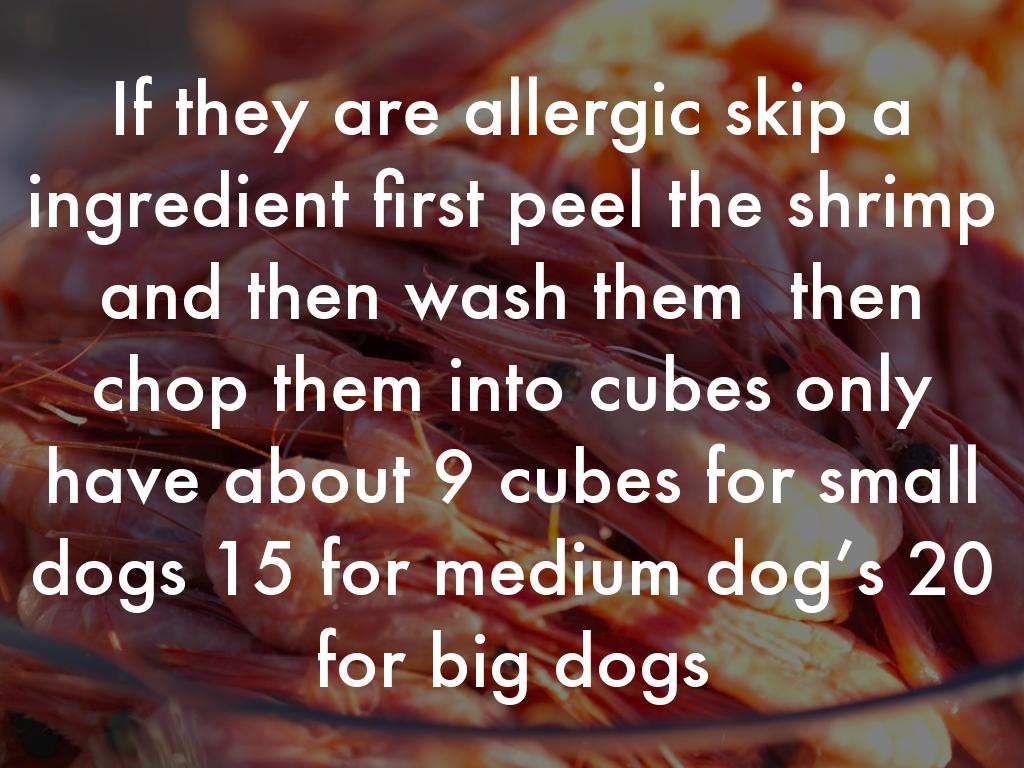 If they are allergic skip a ingredient first peel the shrimp and then wash them then chop them into cubes only have about 9 cubes for small dogs 15 for medium dog’s 20 for big dogs