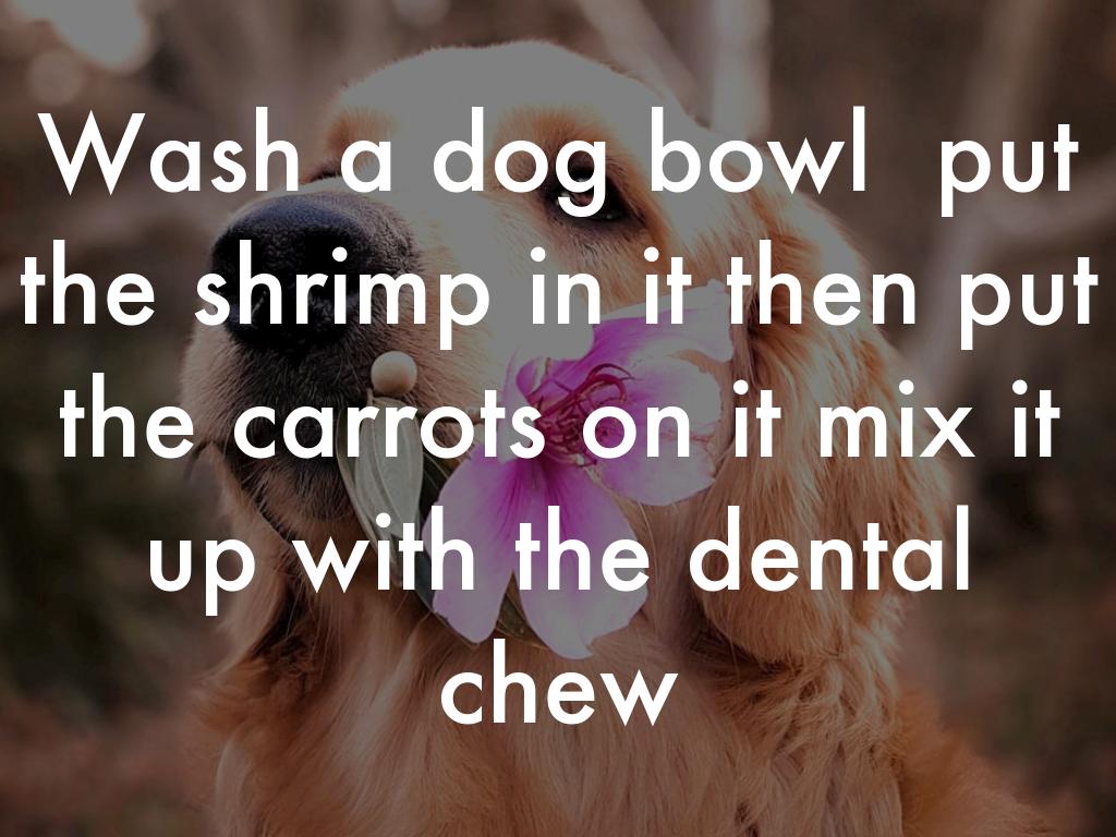 Wash a dog bowl put the shrimp in it then put the carrots on it mix it up with the dental chew