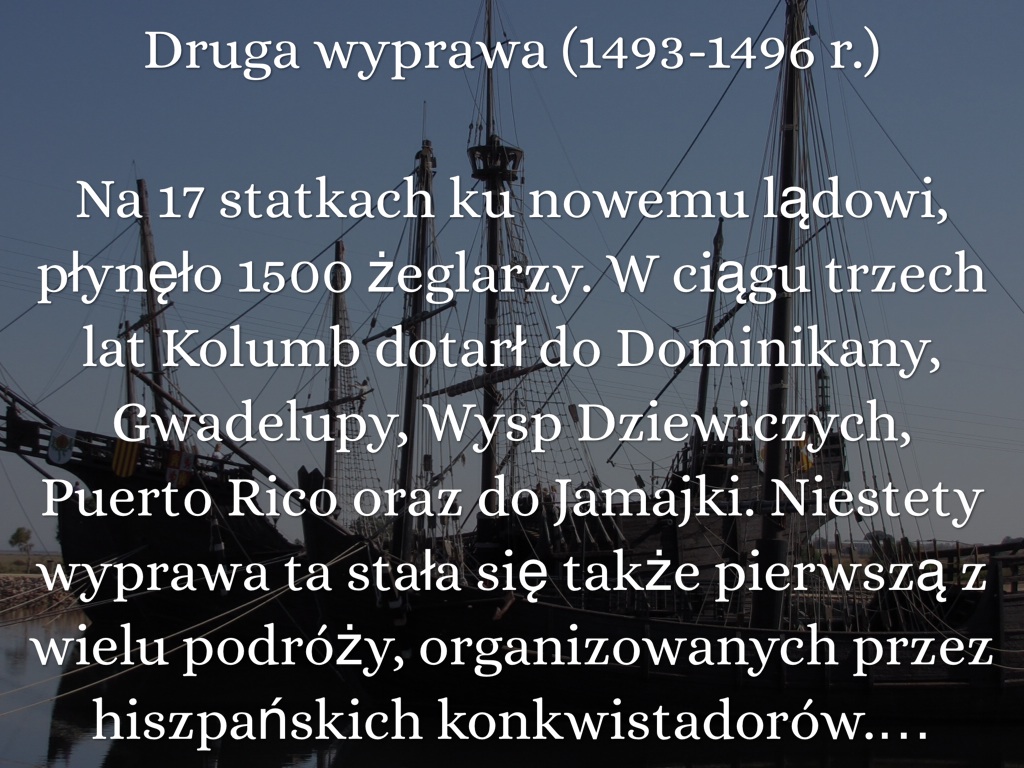 Na 17 statkach ku nowemu lądowi, płynęło 1500 żeglarzy. W ciągu trzech lat Kolumb dotarł do Dominikany, Gwadelupy, Wysp Dziewiczych, Puerto Rico oraz do Jamajki. Niestety wyprawa ta stała się także pierwszą z wielu podróży, organizowanych przez hiszpańskich konkwistadorów.