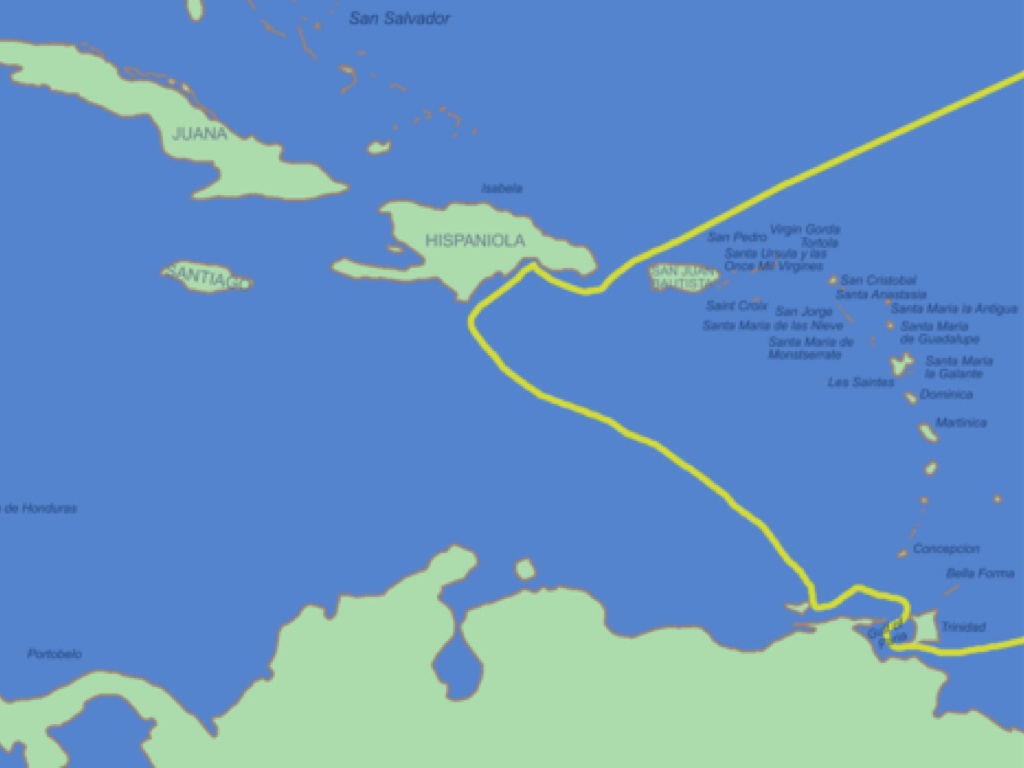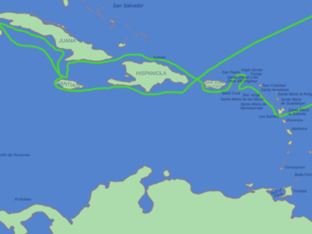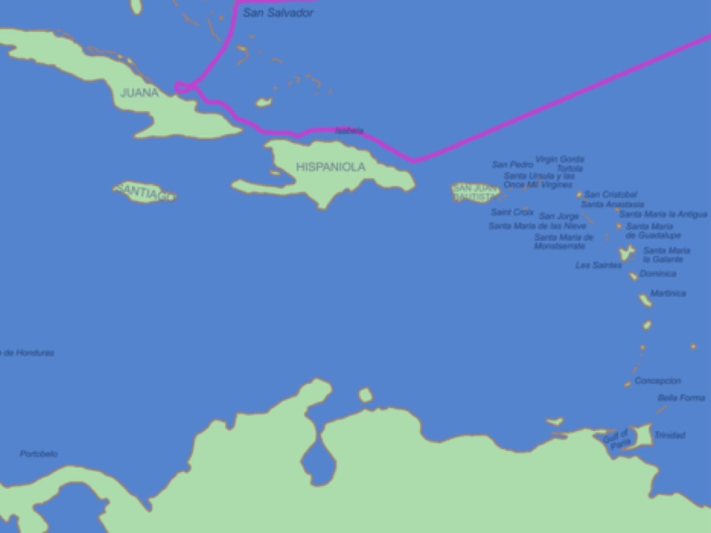 Na trzech statkach, tj. na Santa Marii, Pincie oraz Ninie, osadzono 90-osobową załogę. W dniu 12 października 1492 roku, Kolumb wraz ze swymi żeglarzami, dotarł do wyspy Guanahani, znajdującej się w archipelagu wysp Bahamy. Wyspę tę podróżnicy z Europy nazwali San Salvador. Podczas tej samej wyprawy, Kolumb dotarł do wysp Kuby oraz Haiti. Tę ostatnią nazwał Hispaniolą. Wkrótce okręt flagowy Kolumba, Santa Maria, zatonął, a sam odkrywca zdecydował się na powrót do Hiszpanii.