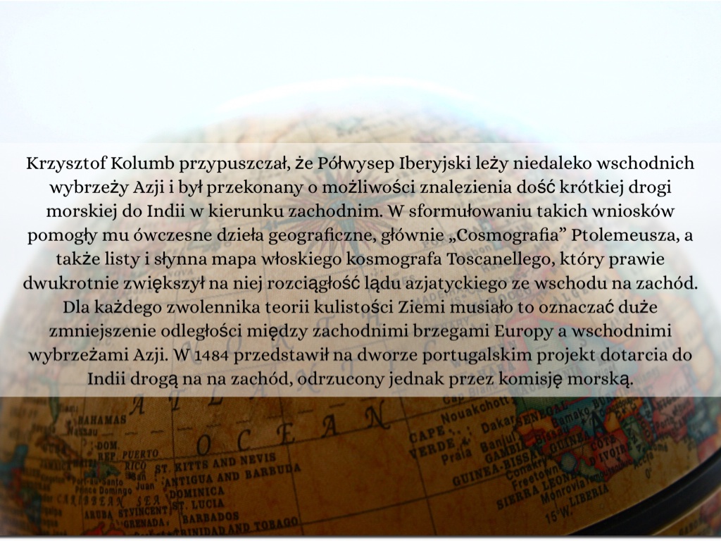 Krzysztof Kolumb przypuszczał, że Półwysep Iberyjski leży niedaleko wschodnich wybrzeży Azji i był przekonany o możliwości znalezienia dość krótkiej drogi morskiej do Indii w kierunku zachodnim. W sformułowaniu takich wniosków pomogły mu ówczesne dzieła geograficzne, głównie „Cosmografia” Ptolemeusza, a także listy i słynna mapa włoskiego kosmografa Toscanellego, który prawie dwukrotnie zwiększył na niej rozciągłość lądu azjatyckiego ze wschodu na zachód. Dla każdego zwolennika teorii kulistości Ziemi musiało to oznaczać duże zmniejszenie odległości między zachodnimi brzegami Europy a wschodnimi wybrzeżami Azji. W 1484 przedstawił na dworze portugalskim projekt dotarcia do Indii drogą na na zachód, odrzucony jednak przez komisję morską.