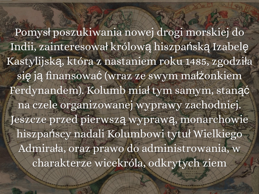 Pomysł poszukiwania nowej drogi morskiej do Indii, zainteresował królową hiszpańską Izabelę Kastylijską, która z nastaniem roku 1485, zgodziła się ją finansować (wraz ze swym małżonkiem Ferdynandem). Kolumb miał tym samym, stanąć na czele organizowanej wyprawy zachodniej. Jeszcze przed pierwszą wyprawą, monarchowie hiszpańscy nadali Kolumbowi tytuł Wielkiego Admirała, oraz prawo do administrowania, w charakterze wicekróla, odkrytych ziem