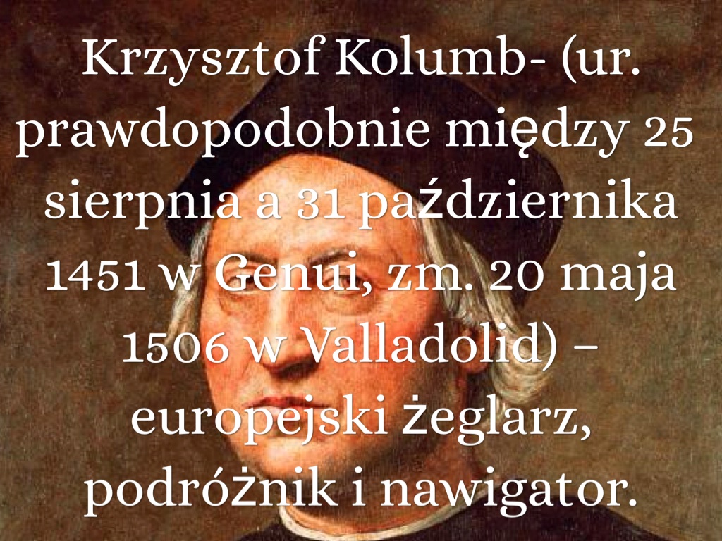 Krzysztof Kolumb- (ur. prawdopodobnie między 25 sierpnia a 31 października 1451 w Genui, zm. 20 maja 1506 w Valladolid) – europejski żeglarz, podróżnik i nawigator.