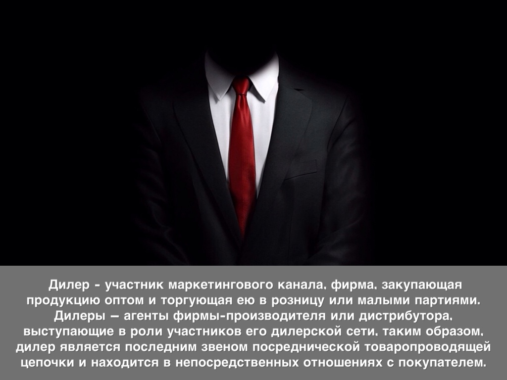 Дилер - участник маркетингового канала, фирма, закупающая продукцию оптом и торгующая ею в розницу или малыми партиями. Дилеры — агенты фирмы-производителя или дистрибутора, выступающие в роли участников его дилерской сети, таким образом, дилер является последним звеном посреднической товаропроводящей цепочки и находится в непосредственных отношениях с покупателем.