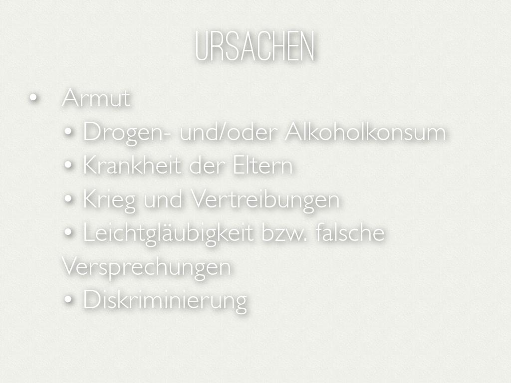 Armut • Drogen- und/oder Alkoholkonsum • Krankheit der Eltern • Krieg und Vertreibungen • Leichtgläubigkeit bzw. falsche Versprechungen • Diskriminierung