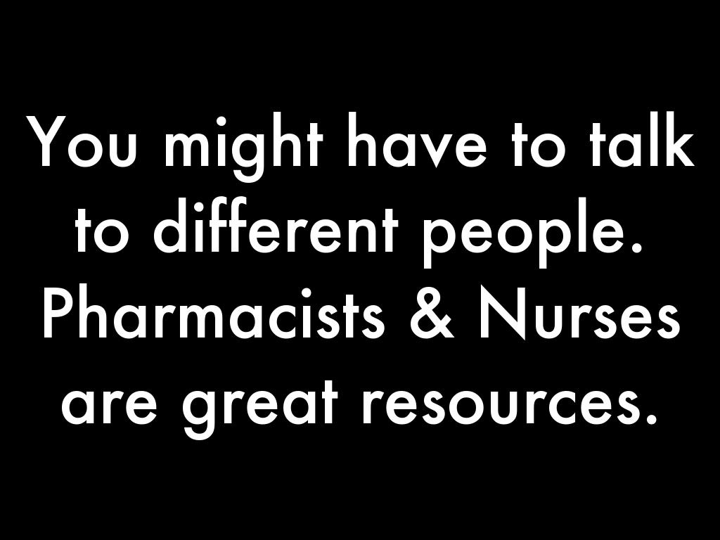 You might have to talk to different people. Pharmacists & Nurses are great resources.