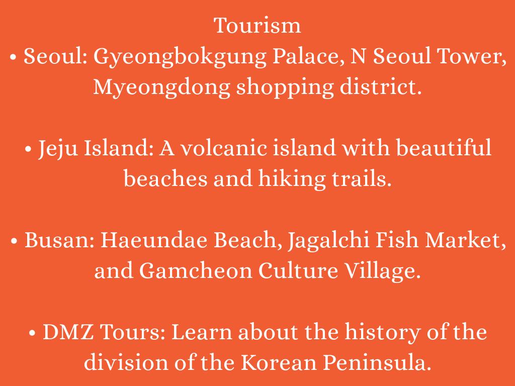 • Busan: Haeundae Beach, Jagalchi Fish Market, and Gamcheon Culture Village.
