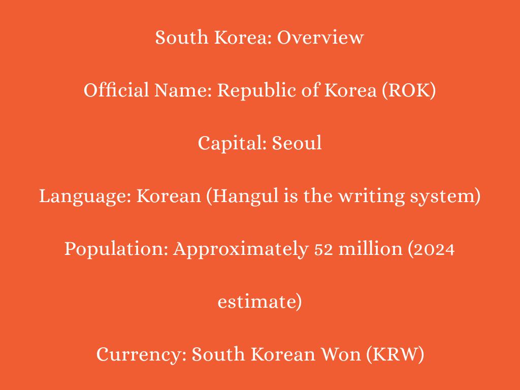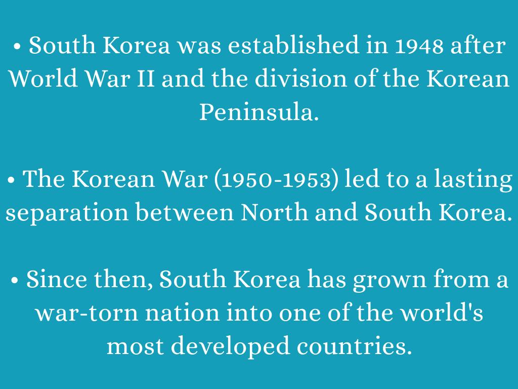 • South Korea was established in 1948 after World War II and the division of the Korean Peninsula.