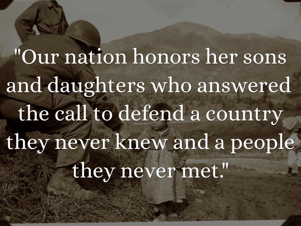 "Our nation honors her sons and daughters who answered the call to defend a country they never knew and a people they never met."