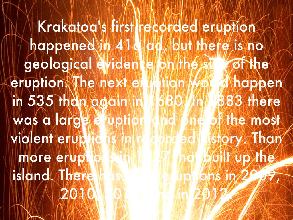 Krakatoa's first recorded eruption happened in 416 ad, but there is no geological evidence on the size of the eruption. The next eruption would happen in 535 than again in 1680. In 1883 there was a large eruption and one of the most violent eruptions in recorded history. Than more eruptions in 1927 that built up the island. There has been eruptions in 2009, 2010, 2011, and in 2012.