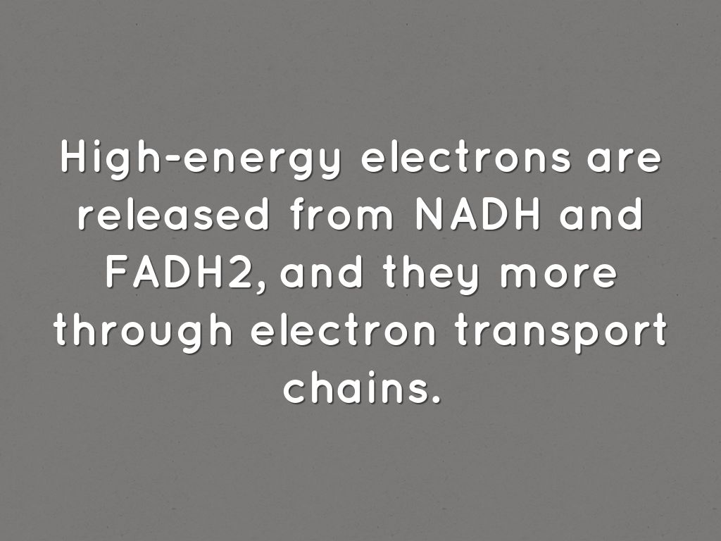 High-energy electrons are released from NADH and FADH2, and they more through electron transport chains.