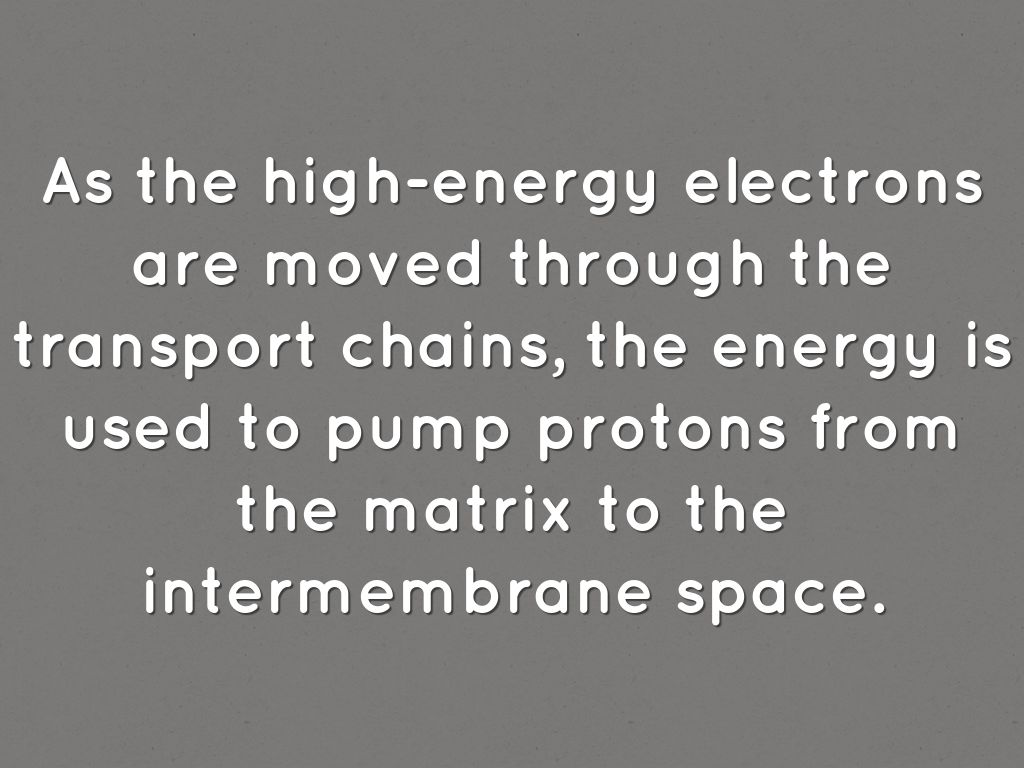 As the high-energy electrons are moved through the transport chains, the energy is used to pump protons from the matrix to the intermembrane space.