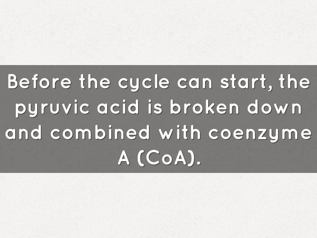 Before the cycle can start, the pyruvic acid is broken down and combined with coenzyme A (CoA).