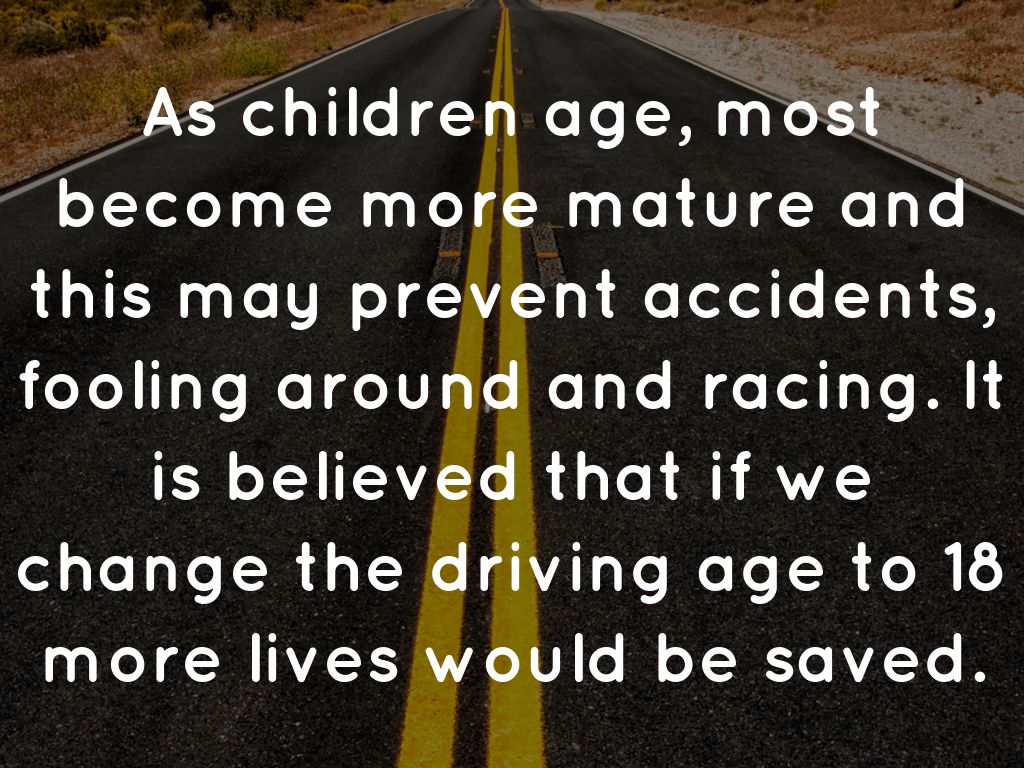 As children age, most become more mature and this may prevent accidents, fooling around and racing. It is believed that if we change the driving age to 18 more lives would be saved.