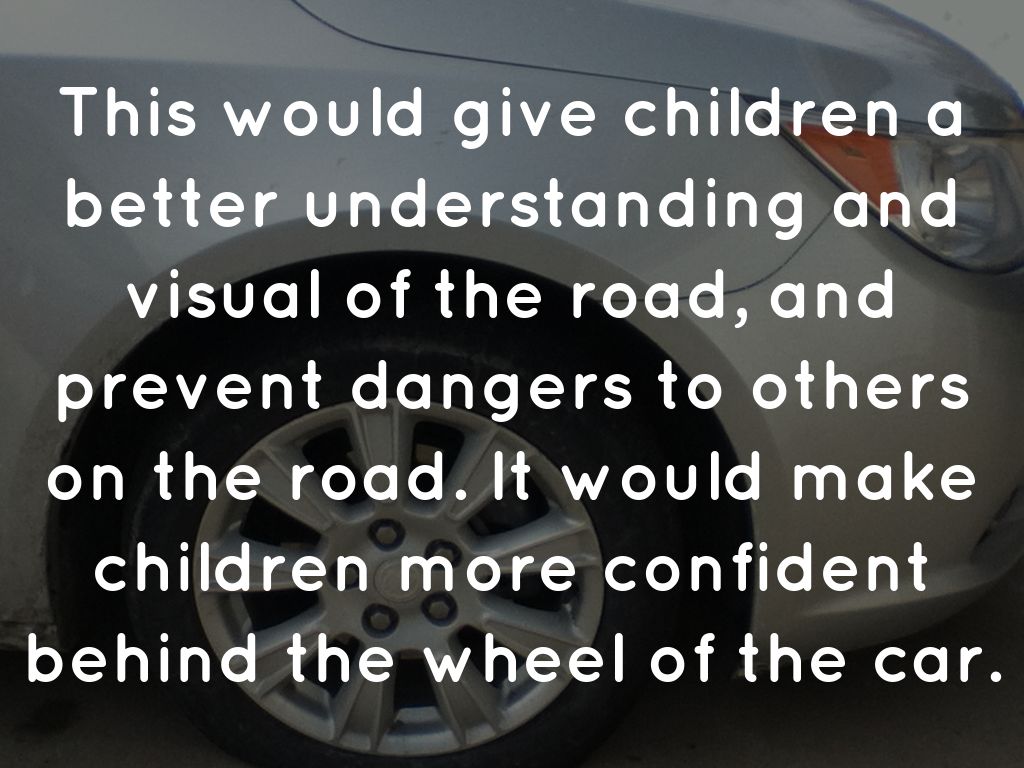 This would give children a better understanding and visual of the road, and prevent dangers to others on the road. It would make children more confident behind the wheel of the car.
