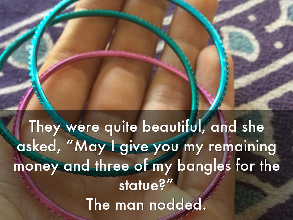 They were quite beautiful, and she asked, “May I give you my remaining money and three of my bangles for the statue?”