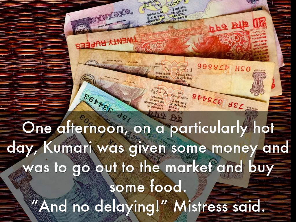 One afternoon, on a particularly hot day, Kumari was given some money and was to go out to the market and buy some food.