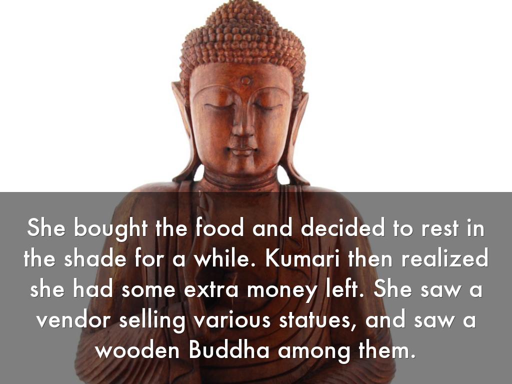 She bought the food and decided to rest in the shade for a while. Kumari then realized she had some extra money left. She saw a vendor selling various statues, and saw a wooden Buddha among them.