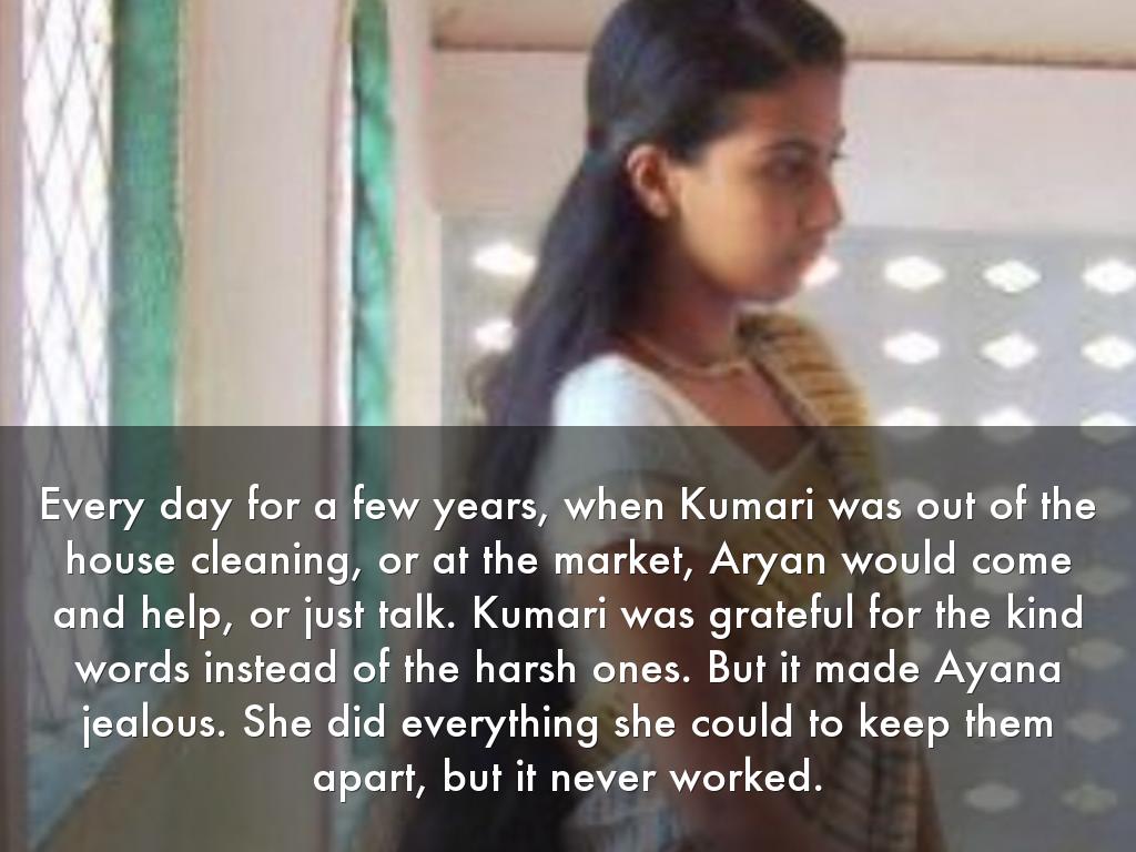 Every day for a few years, when Kumari was out of the house cleaning, or at the market, Aryan would come and help, or just talk. Kumari was grateful for the kind words instead of the harsh ones. But it made Ayana jealous. She did everything she could to keep them apart, but it never worked.