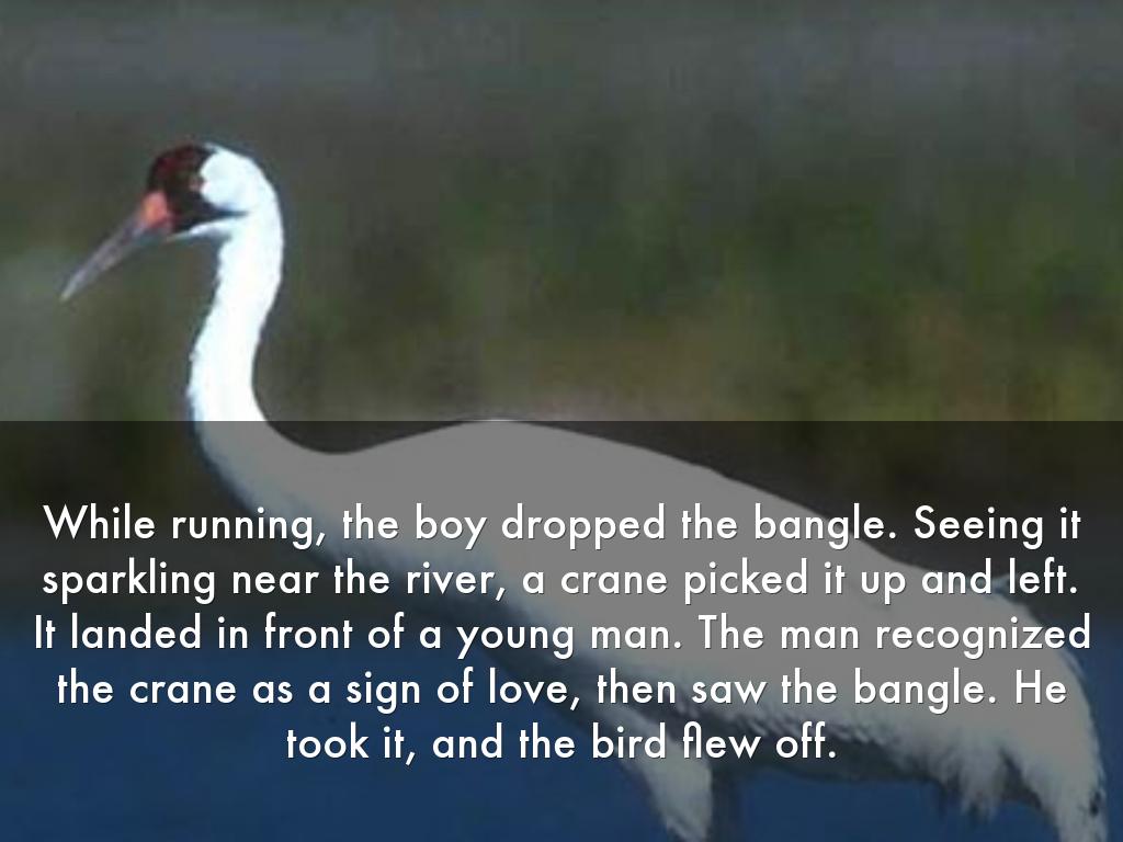 It landed in front of a young man. The man recognized the crane as a sign of love, then saw the bangle. He took it, and the bird flew off.