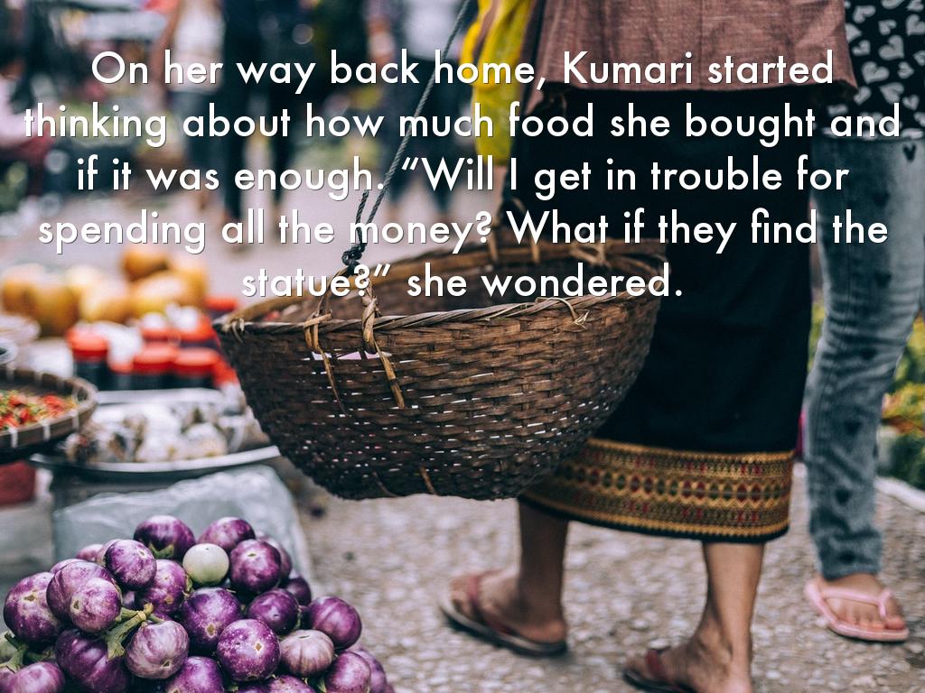 On her way back home, Kumari started thinking about how much food she bought and if it was enough. “Will I get in trouble for spending all the money? What if they find the statue?” she wondered.