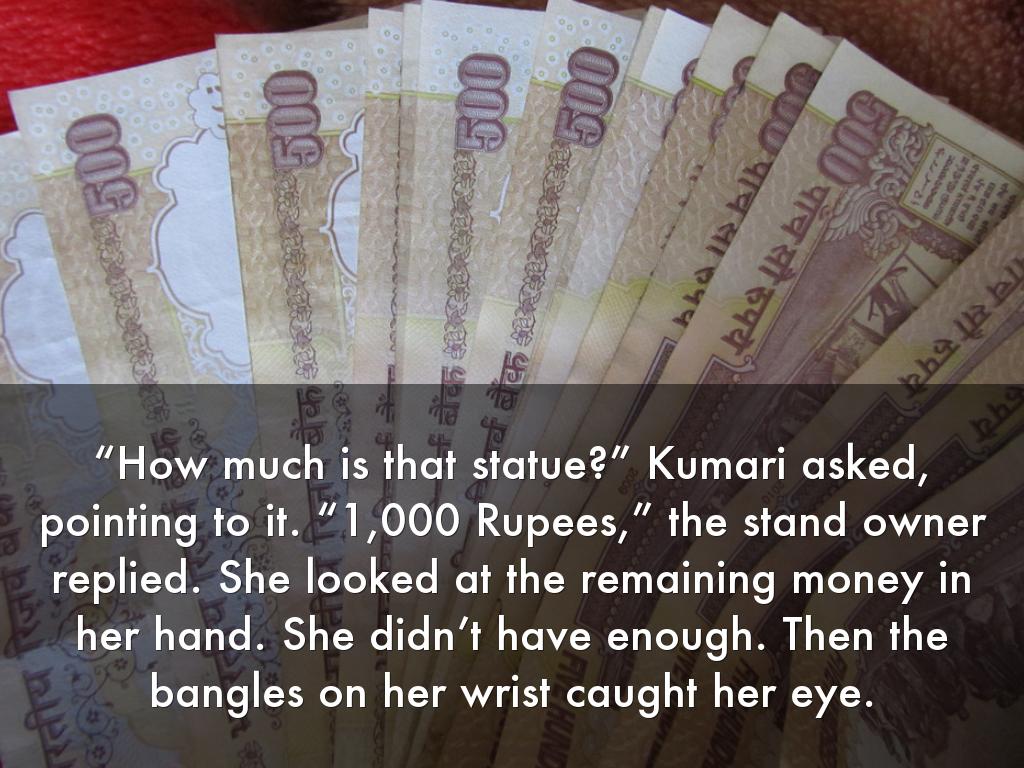 “How much is that statue?” Kumari asked, pointing to it. “1,000 Rupees,” the stand owner replied. She looked at the remaining money in her hand. She didn’t have enough. Then the bangles on her wrist caught her eye.