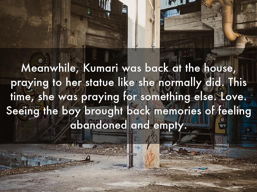 Meanwhile, Kumari was back at the house, praying to her statue like she normally did. This time, she was praying for something else. Love. Seeing the boy brought back memories of feeling abandoned and empty.