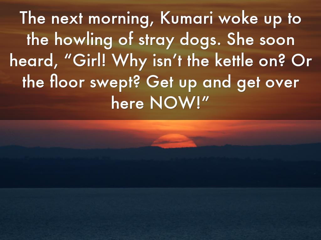 The next morning, Kumari woke up to the howling of stray dogs. She soon heard, “Girl! Why isn’t the kettle on? Or the floor swept? Get up and get over here NOW!”