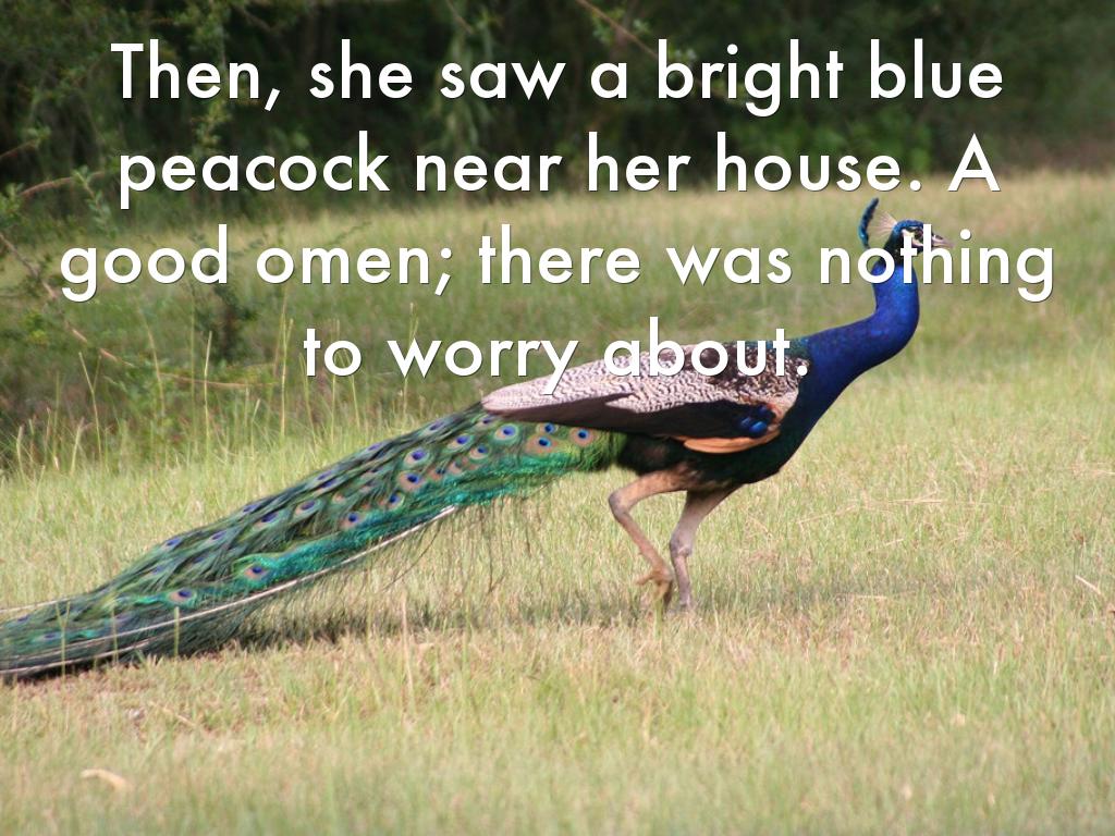 Then, she saw a bright blue peacock near her house. A good omen; there was nothing to worry about.