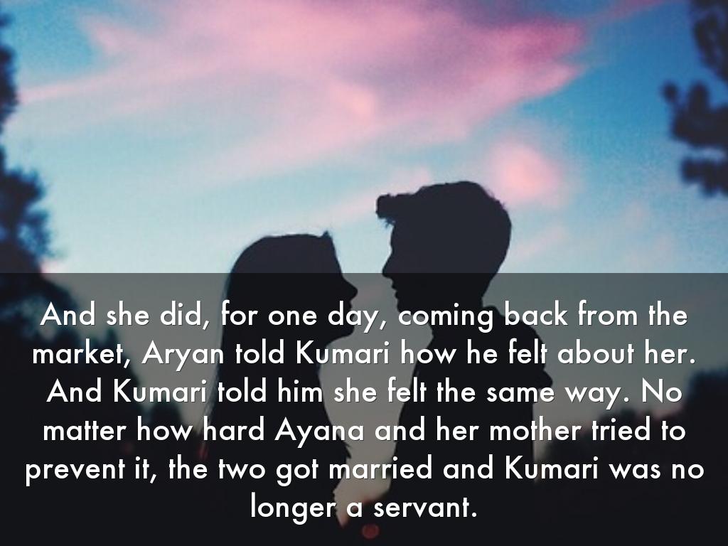 And she did, for one day, coming back from the market, Aryan told Kumari how he felt about her. And Kumari told him she felt the same way. No matter how hard Ayana and her mother tried to prevent it, the two got married and Kumari was no longer a servant.