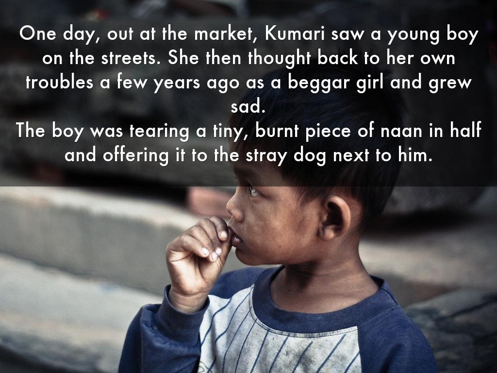 One day, out at the market, Kumari saw a young boy on the streets. She then thought back to her own troubles a few years ago as a beggar girl and grew sad.