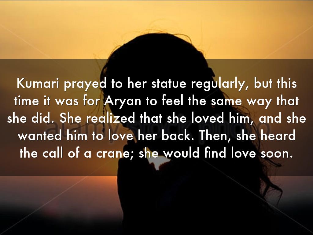 Kumari prayed to her statue regularly, but this time it was for Aryan to feel the same way that she did. She realized that she loved him, and she wanted him to love her back. Then, she heard the call of a crane; she would find love soon.