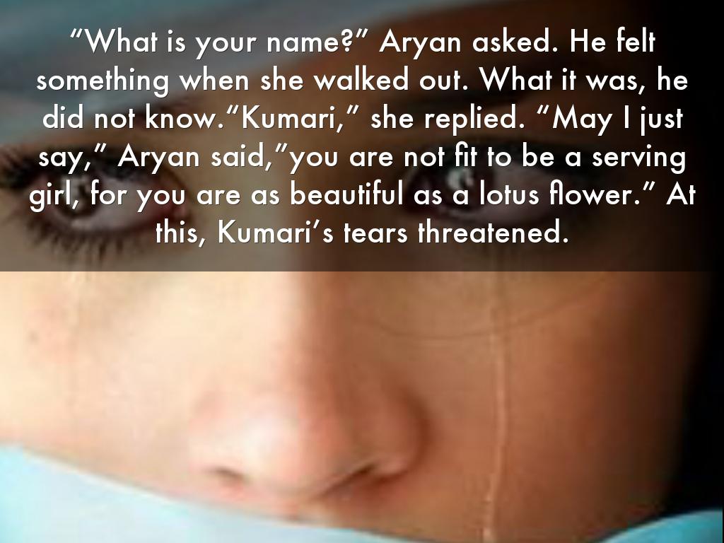 “What is your name?” Aryan asked. He felt something when she walked out. What it was, he did not know.“Kumari,” she replied. “May I just say,” Aryan said,”you are not fit to be a serving girl, for you are as beautiful as a lotus flower.” At this, Kumari’s tears threatened.