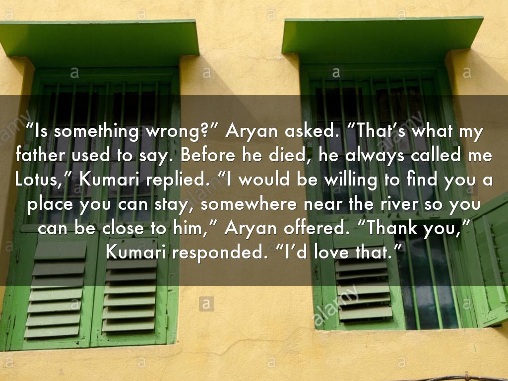 “Is something wrong?” Aryan asked. “That’s what my father used to say. Before he died, he always called me Lotus,” Kumari replied. “I would be willing to find you a place you can stay, somewhere near the river so you can be close to him,” Aryan offered. “Thank you,” Kumari responded. “I’d love that.”