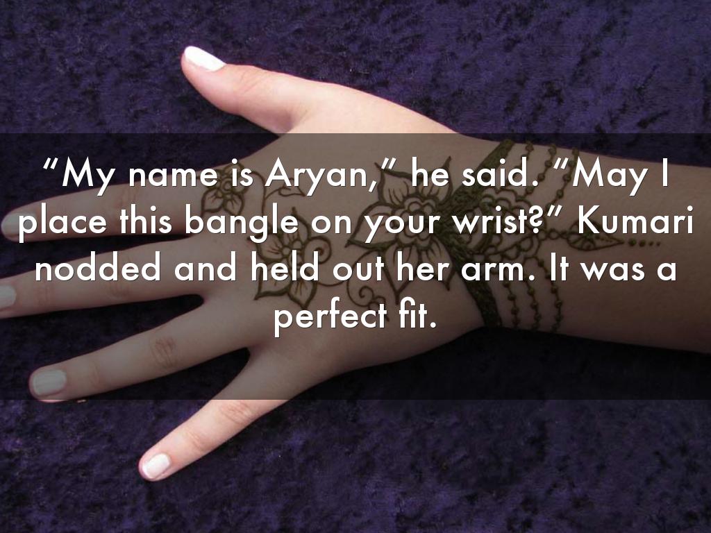 “My name is Aryan,” he said. “May I place this bangle on your wrist?” Kumari nodded and held out her arm. It was a perfect fit.