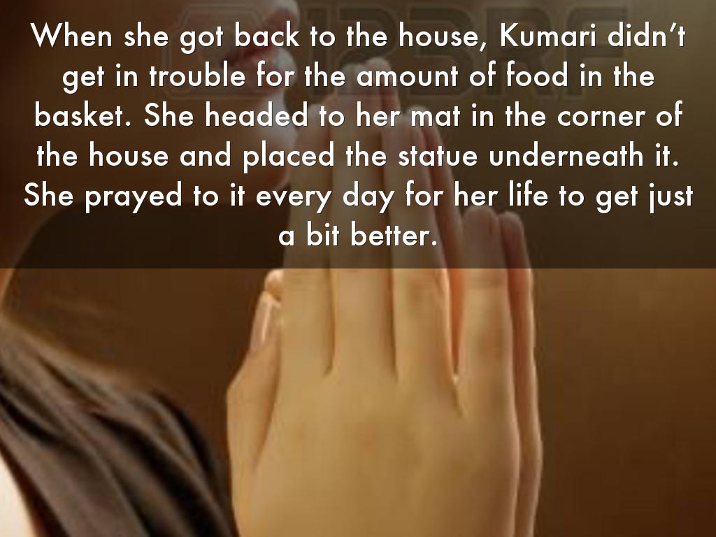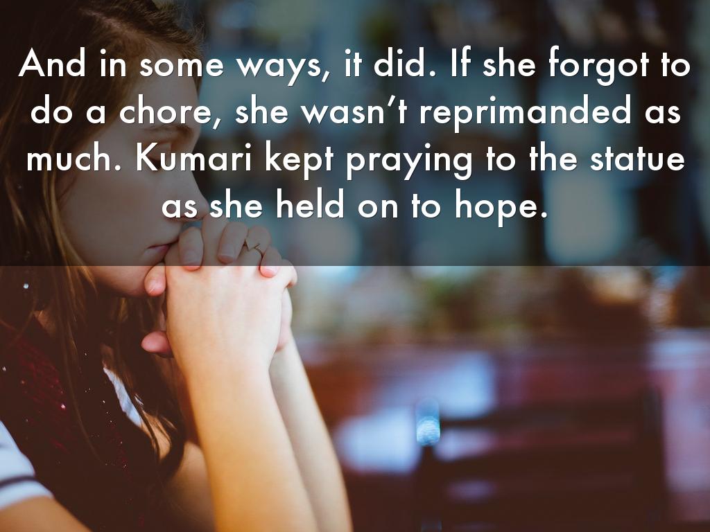 And in some ways, it did. If she forgot to do a chore, she wasn’t reprimanded as much. Kumari kept praying to the statue as she held on to hope.