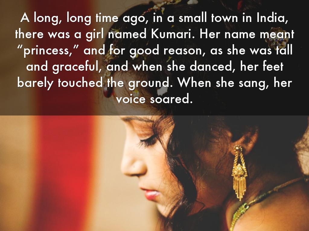 A long, long time ago, in a small town in India, there was a girl named Kumari. Her name meant “princess,” and for good reason, as she was tall and graceful, and when she danced, her feet barely touched the ground. When she sang, her voice soared.