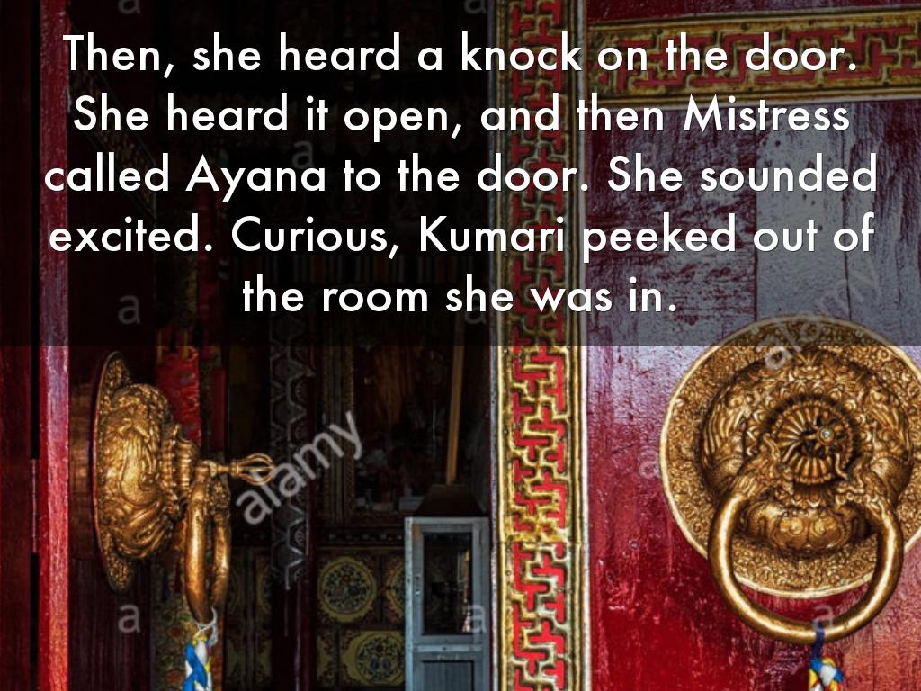 Then, she heard a knock on the door. She heard it open, and then Mistress called Ayana to the door. She sounded excited. Curious, Kumari peeked out of the room she was in.