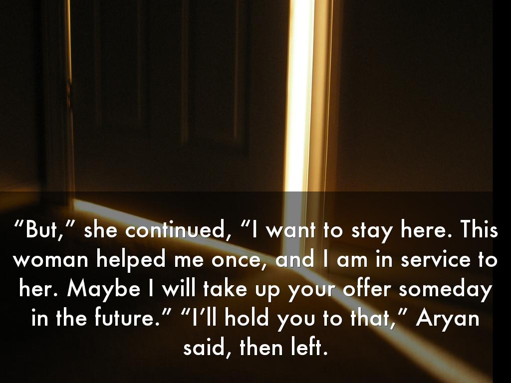“But,” she continued, “I want to stay here. This woman helped me once, and I am in service to her. Maybe I will take up your offer someday in the future.” “I’ll hold you to that,” Aryan said, then left.