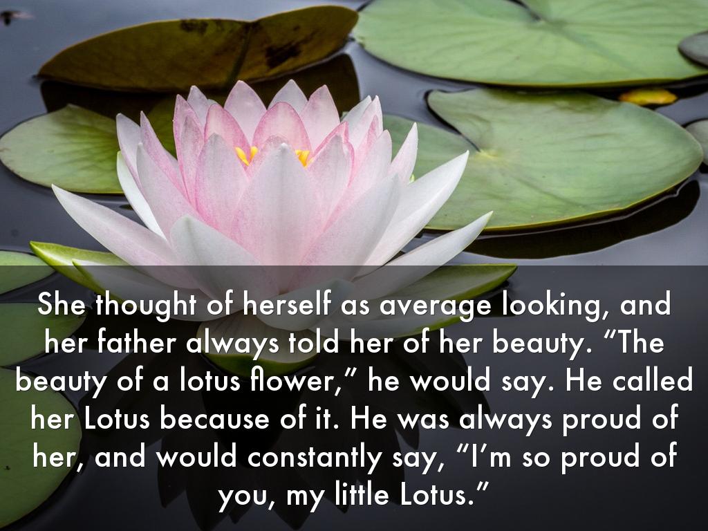 She thought of herself as average looking, and her father always told her of her beauty. “The beauty of a lotus flower,” he would say. He called her Lotus because of it. He was always proud of her, and would constantly say, “I’m so proud of you, my little Lotus.”
