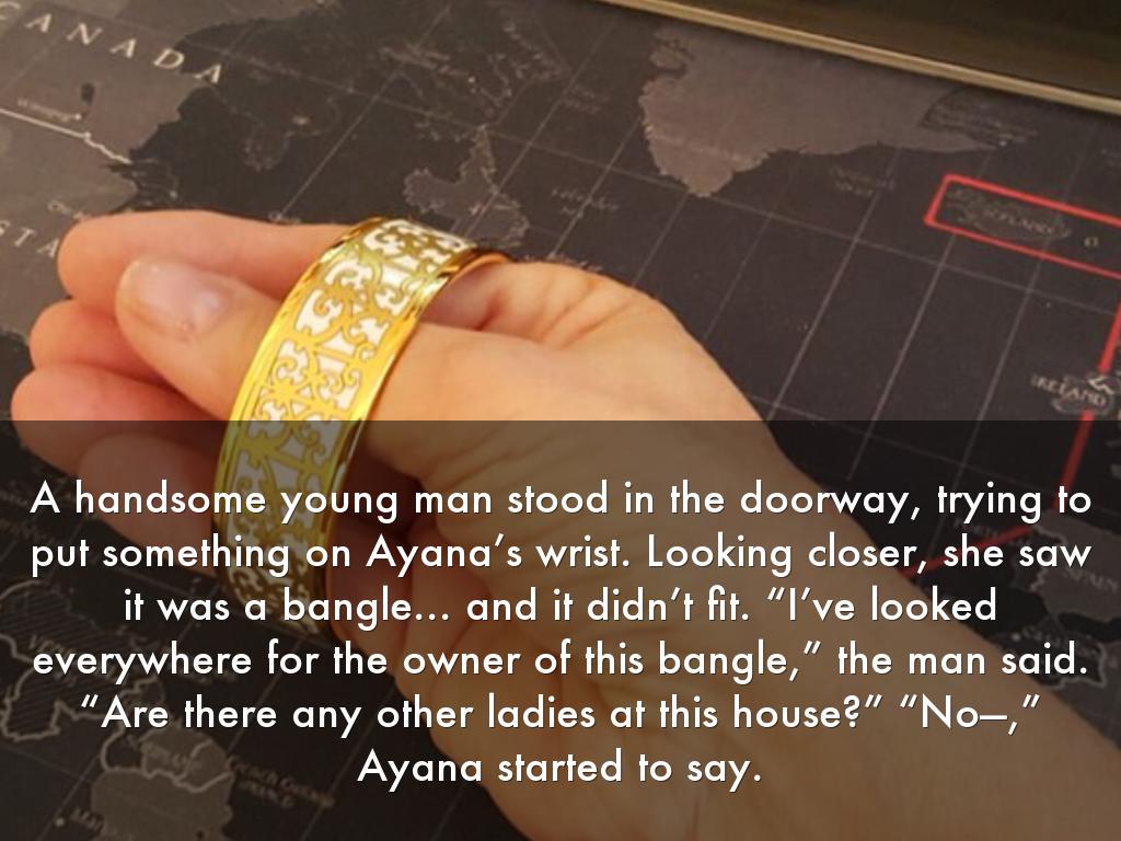 A handsome young man stood in the doorway, trying to put something on Ayana’s wrist. Looking closer, she saw it was a bangle... and it didn’t fit. “I’ve looked everywhere for the owner of this bangle,” the man said. “Are there any other ladies at this house?” “No—,” Ayana started to say.