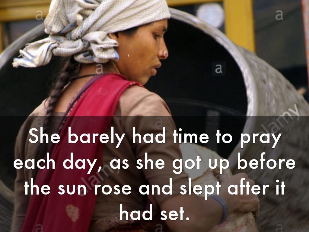 She barely had time to pray each day, as she got up before the sun rose and slept after it had set.
