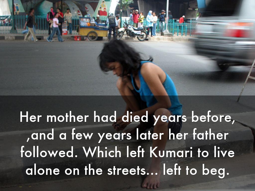 Her mother had died years before, ,and a few years later her father followed. Which left Kumari to live alone on the streets... left to beg.