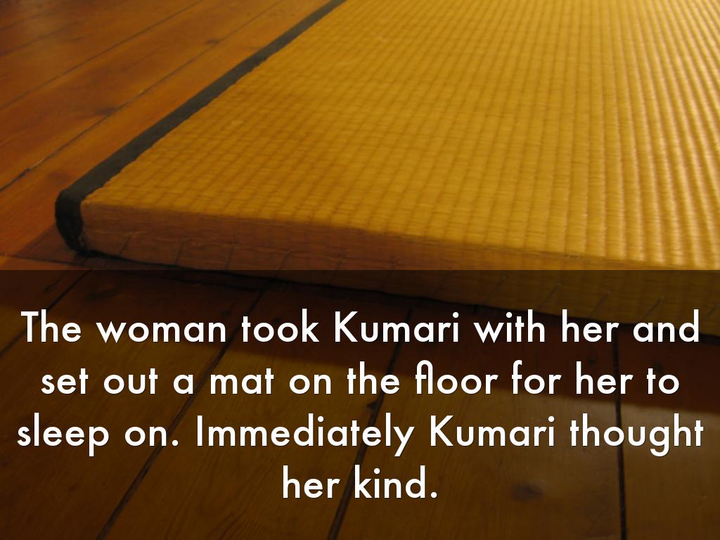 The woman took Kumari with her and set out a mat on the floor for her to sleep on. Immediately Kumari thought her kind.