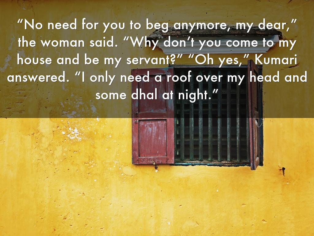 “No need for you to beg anymore, my dear,” the woman said. “Why don’t you come to my house and be my servant?” “Oh yes,” Kumari answered. “I only need a roof over my head and some dhal at night.”